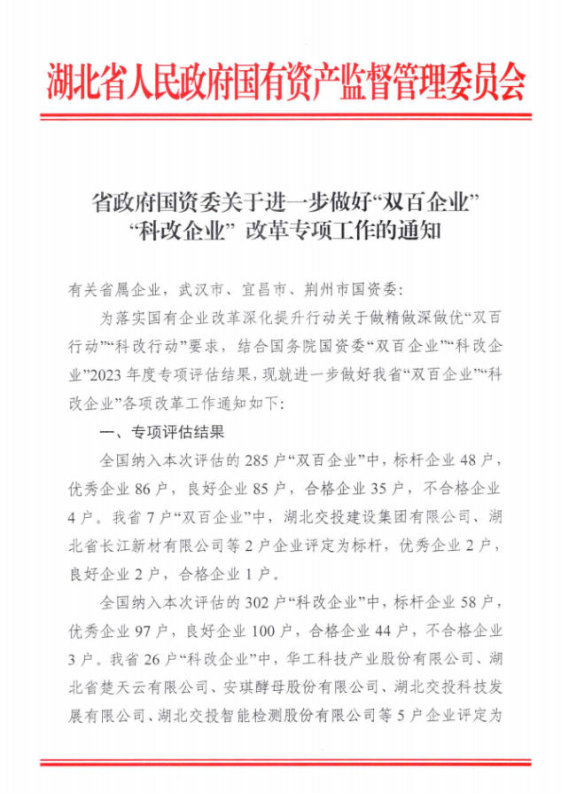 本次考核是國(guó)資委組織對(duì)地方所屬“科改”“雙百”企業(yè)年度改革創(chuàng)新情況開(kāi)展的專(zhuān)項(xiàng)考核,湖北省納入本次考核的科改企業(yè)26戶(hù),優(yōu)秀企業(yè)8戶(hù)。