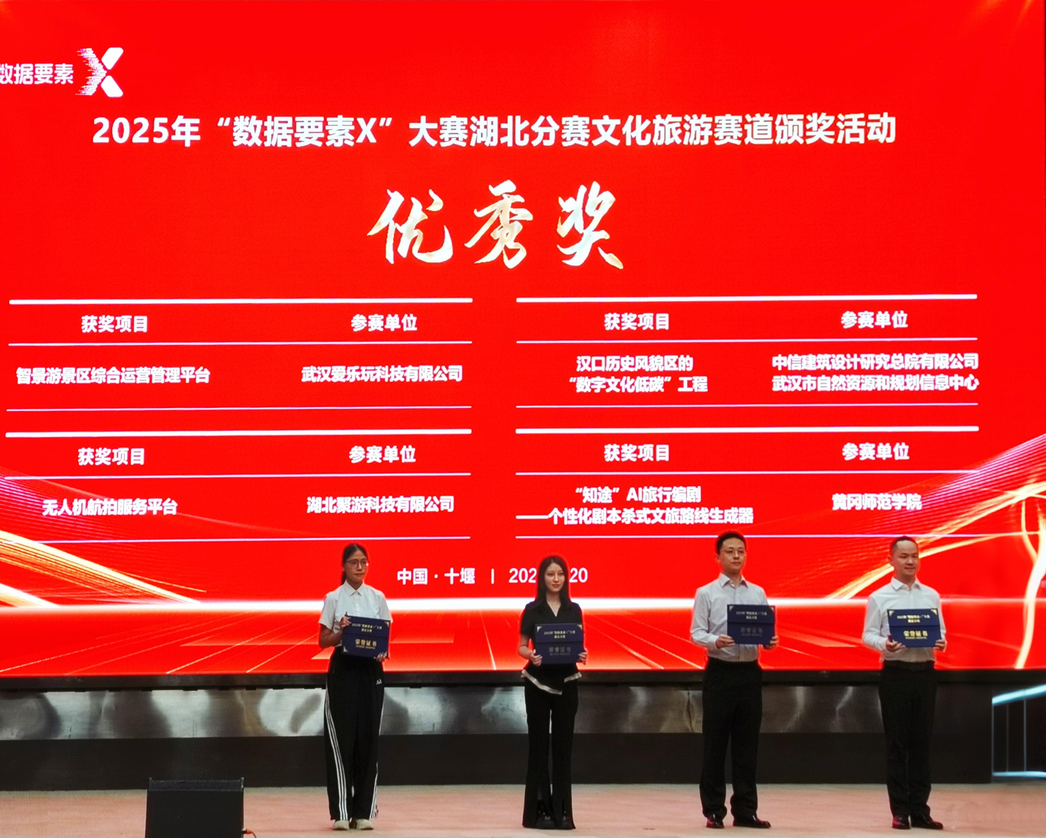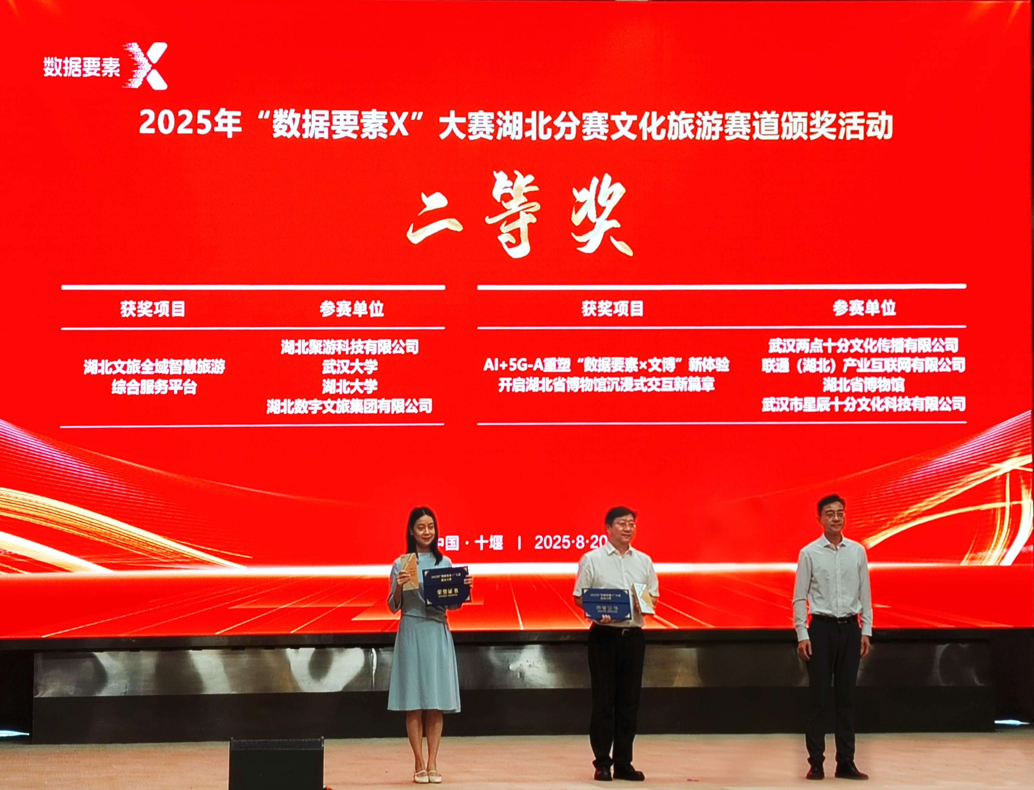 8月20日,由湖北省數(shù)據(jù)局、湖北省文化和旅游廳、十堰市人民政府主辦的2025年“數(shù)據(jù)要素×”大賽湖北分賽文化旅游賽道決賽活動(dòng)在十堰成功舉行。數(shù)旅集團(tuán)參賽項(xiàng)目均獲得獎(jiǎng)項(xiàng),湖北文旅全域智慧旅游綜合服務(wù)平臺(tái)獲二等獎(jiǎng)(賽道第2名)、“逍遙武當(dāng)”VR大空間沉浸式體驗(yàn)項(xiàng)目獲三等獎(jiǎng)(賽道第4名)、無人機(jī)航拍服務(wù)平臺(tái)和智景游景區(qū)綜合運(yùn)營管理平臺(tái)獲優(yōu)秀獎(jiǎng)。在參賽數(shù)量、入圍率及獎(jiǎng)項(xiàng)層級(jí)上均實(shí)現(xiàn)顯著突破,充分彰顯了公司在數(shù)據(jù)要素領(lǐng)域的技術(shù)積累與創(chuàng)新實(shí)力。