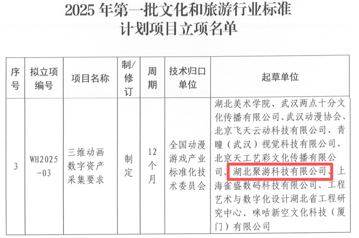 近日,文化和旅游部科技教育司發(fā)布了2025年第一批文化和旅游標準計劃項目立項名單。由數(shù)旅集團旗下聚游科技參與制定的《三維動畫數(shù)字資產(chǎn)采集要求》成功入選,實現(xiàn)了在文旅行業(yè)標準化領(lǐng)域的重大突破。