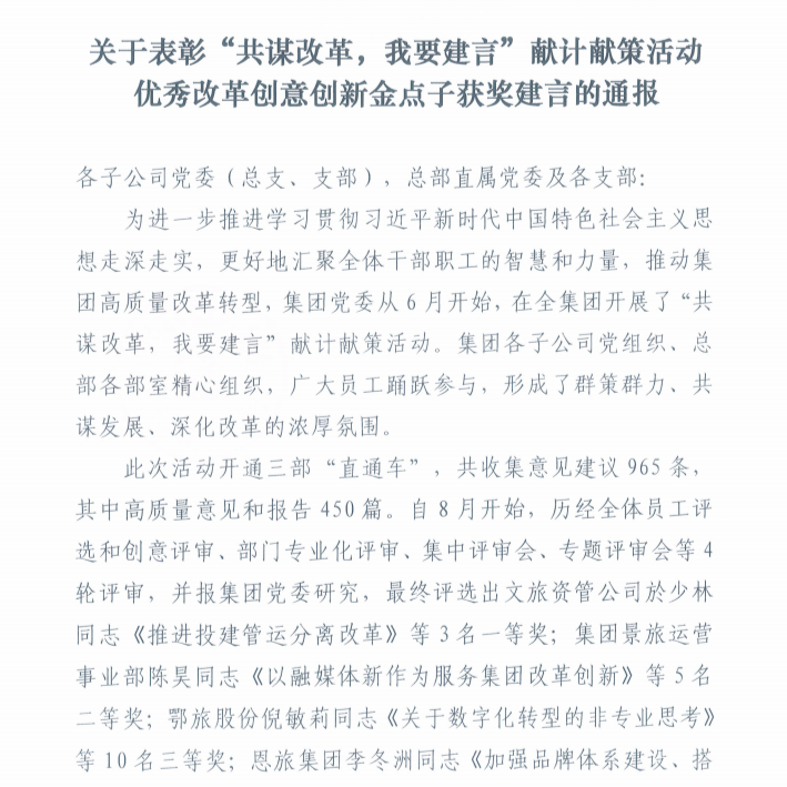 數(shù)旅集團獲“共謀改革、我要建言”優(yōu)秀獎