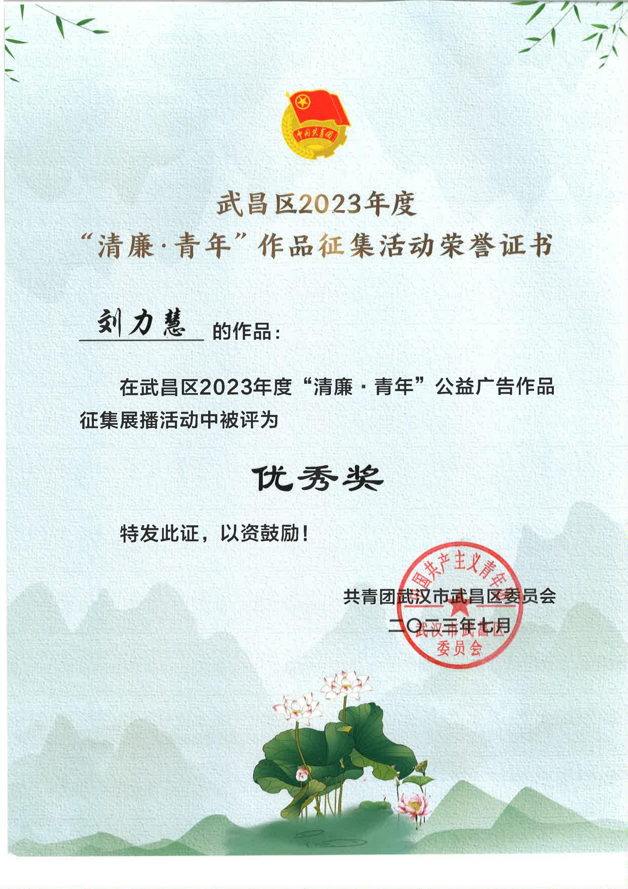 日前,在武漢市武昌區(qū)共青團團委組織2023年度“清廉·青年”文化作品征集展播活動中,由湖北數字文旅集團湖北聚游科技有限公司團支部選送的“不貪為寶”書法作品被評為優(yōu)秀獎。